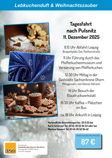 Verbindliche Anmeldung bis 25. November 2025 bei Karin Schirmer, Tel. 03 41-35 52 04 53 (AB) oder Martina Siewert, Tel. 03 41-35 52 04 42